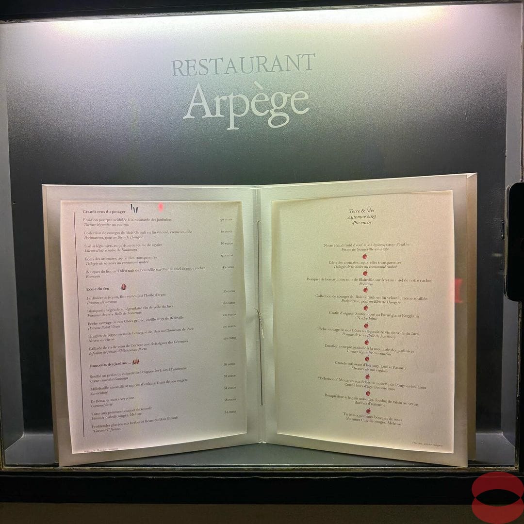 L’Arpège. Alain Passard is one of a handful of cooks who have remained at the top of global fine dining for decades. He was a master rotisserie and then one day decided to forgo fish and meat and focus on vegetables. These vegetables, grown on a farm north of Paris are delivered to the restaurant daily. Passard eventually brought back fish and poultry. This is my second visit and my feeling is that Passard is running out of steam. The food is good but not creative. It lacks the wow factor. I left satisfied but not convinced, with mixed feelings. Paris is expensive and visiting Chef Passard is no different despite the lack of traditional luxury ingredients. Expected better on dessert And they don’t serve Coke!!