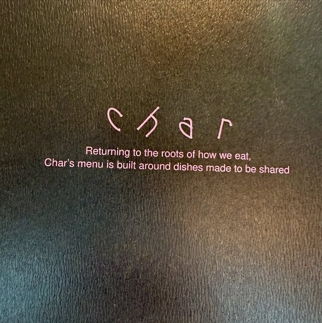 Char is a contemporary grill bar with a primal heart. Our focus is simple: we bring the raw essence of the open flame back to the heart of the table returning to the roots of how we eat Char’s menu is built around dishes made to be shared.
