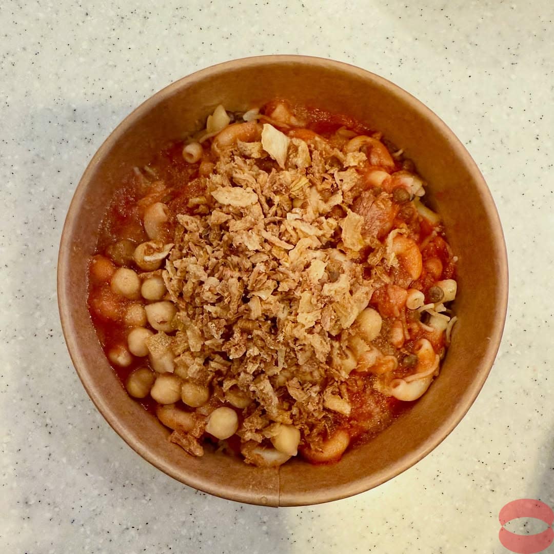 It is Egypt’s national dish, eaten daily by over 30 million people: Koshari is a healthy, tasty, & nutrient-rich mix of grains, chickpeas, zesty tomato sauce, marinated & spiced plant/protein, topped with crispy onion shavings, and a sprinkling of doqqa nuts, straight from the souks of Cairo.