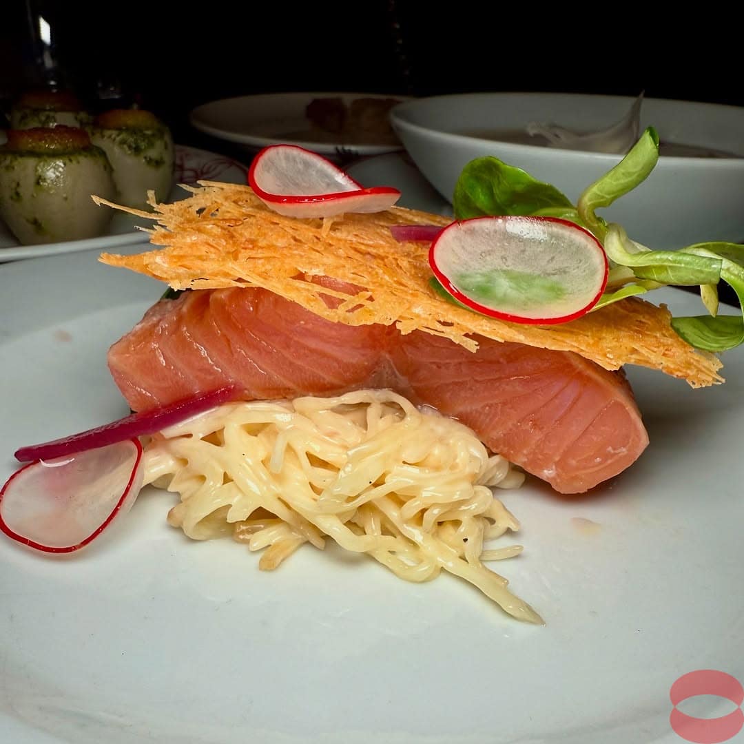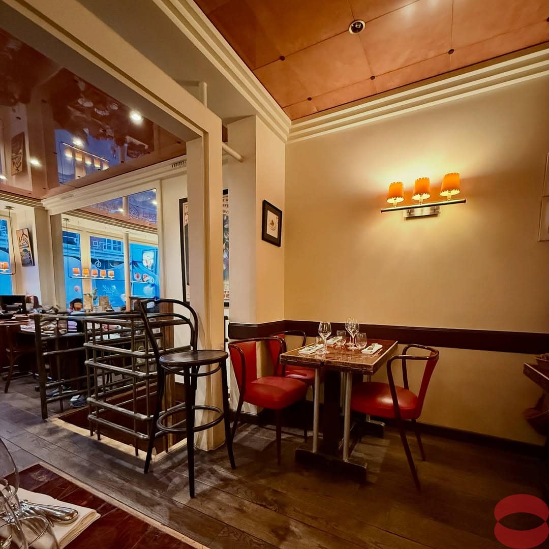 Acid-etched windows, a magnificent decorated ceiling, a veined marble counter, wooden tables and chairs, a semi-open kitchen: all the images of a typical Parisian bistro pass before the customers’ eyes. Added to this, Alain Huchet’s gastronomic engravings hang on the wall. A place in keeping with the spirit the chef wanted to instill.