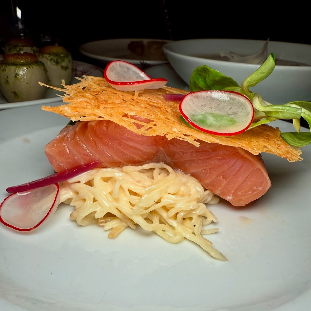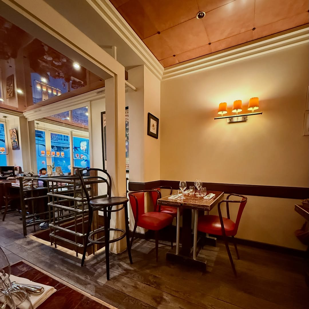 Acid-etched windows, a magnificent decorated ceiling, a veined marble counter, wooden tables and chairs, a semi-open kitchen: all the images of a typical Parisian bistro pass before the customers’ eyes. Added to this, Alain Huchet’s gastronomic engravings hang on the wall. A place in keeping with the spirit the chef wanted to instill.