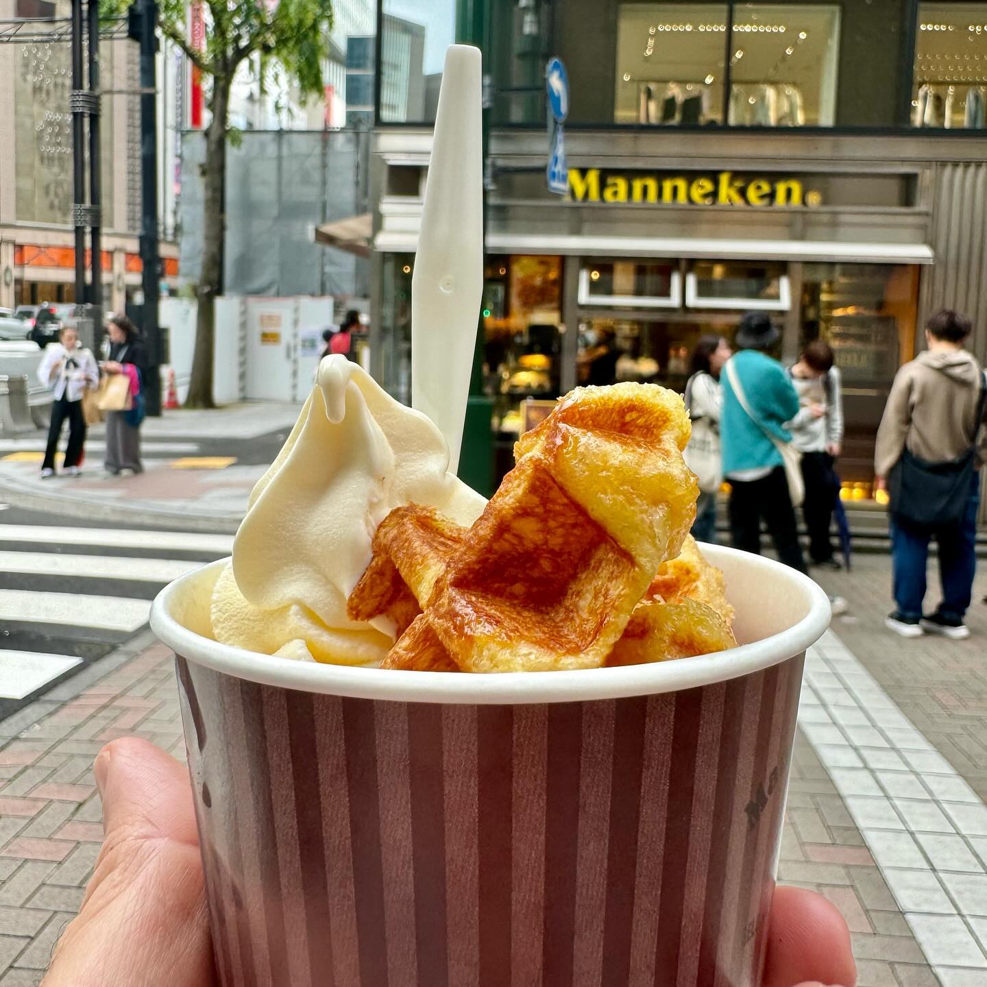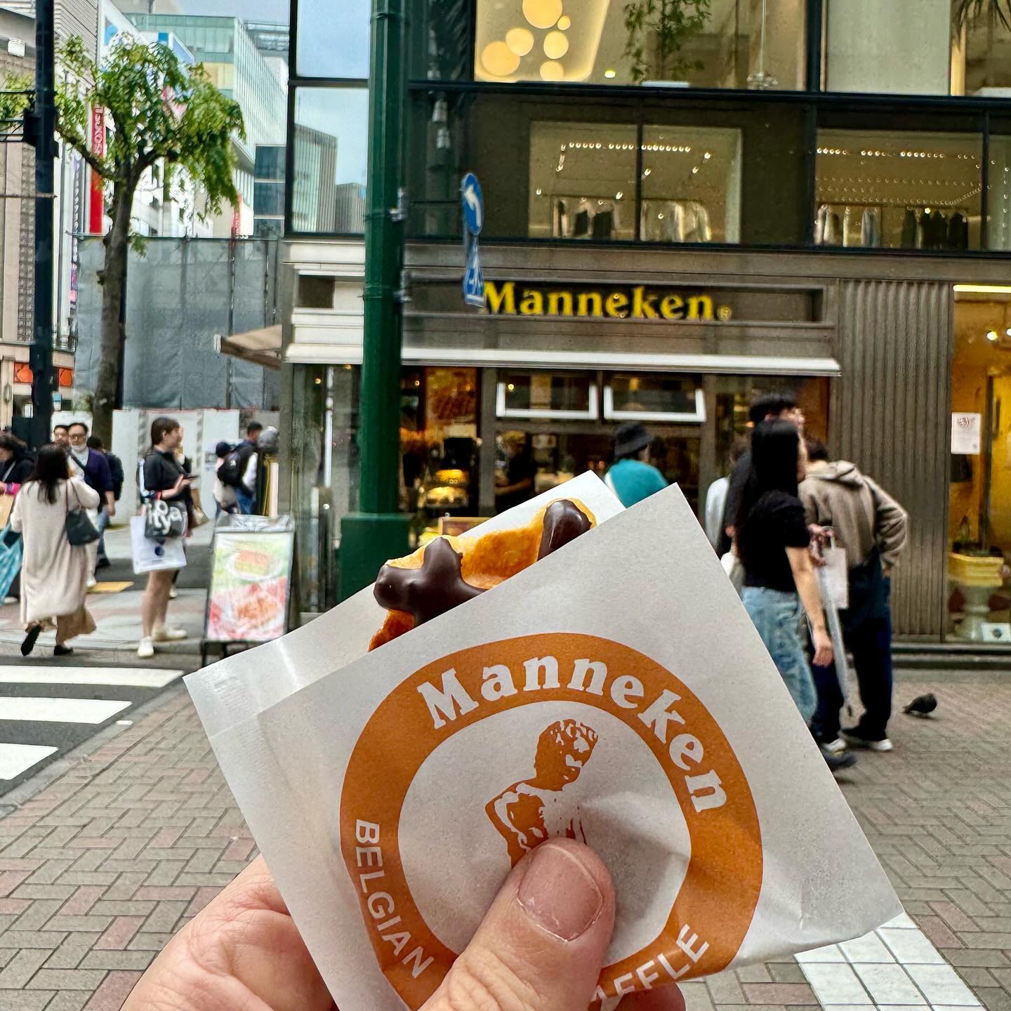 Manneken Belgian Waffle, ask for Atsui (hot from oven). They have different flavours. I went for the plain and with chocolate.