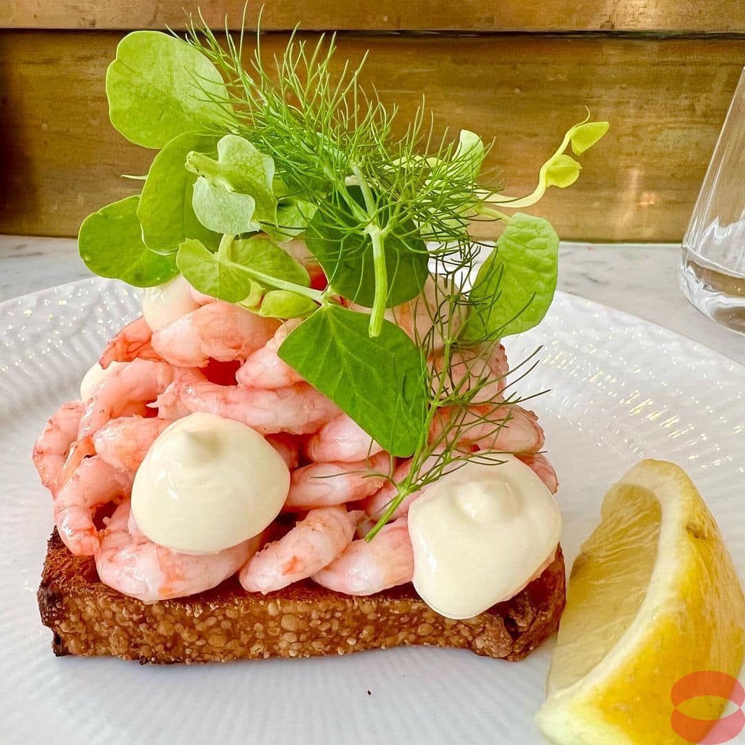 Montergade, serving Classic #danish #smørrebrød . Smorrebrod is a traditional open faced sandwich in the cuisines of Denmark, Norway and Sweden that usually consists of a piece of buttered rye bread, topped with commercial or home-made cold cuts, pieces of meat or fish, cheese or spreads and garnishes. My rating is #very_good.